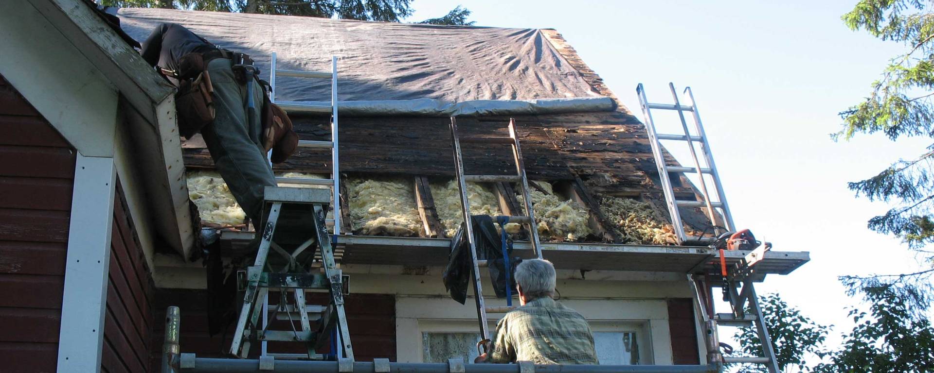 Mid-May 2016 – The new roof for the Red Dragon is underway! Carbon Neutral Alternatives is the contractor doing the work. Steve and Laramie (and periodically others) started on the south side, tearing off the old and, unfortunately, finding more rot and insulation needing replacement than we had hoped. They sistered new rafters in, where necessary; added new insulation as well; and finished with new plywood (for the most part), and finally installed the ice and water shield. Before finishing the work with the shingles, they’re waiting to receive a membrane material that goes below the shingles (barge delivery of that is expected June 19th!).